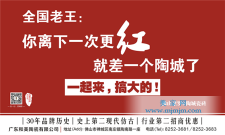 陶城瓷磚憑借優厚的招商政策、創新領先的新品以及全方位的服務扶持,為選擇品牌代理的你創造了千載難逢的契機,如果你還在挑選陶瓷品牌的話,那么具有雄厚實力以及遠大“錢景”的陶城瓷磚絕對是你的首選。不要再猶疑,不要再俳徊,請鎖定陶城瓷磚,你離下一次更紅,就差一個陶城了!