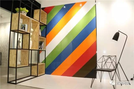 色彩斑斕的背景墻、木制置物架、不規(guī)則鐵制坐椅的組合與素白色系的地、墻磚產(chǎn)生強(qiáng)烈的視覺沖擊,優(yōu)雅中又有些許躍動(dòng)的妙趣。