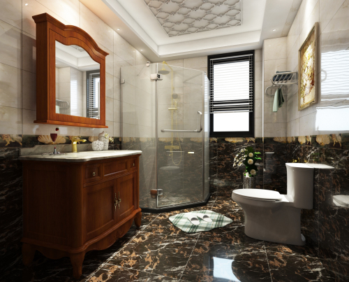 濃郁的米灰色墻板與充滿美式風(fēng)格的復(fù)古質(zhì)感風(fēng)格浴室柜形成強(qiáng)烈的撞擊,恰如其分的胡桃色點綴,亦能緩和冰冷浴室?guī)淼膲阂指小M高^復(fù)古的風(fēng)格情調(diào),更顯沉穩(wěn)、大氣。