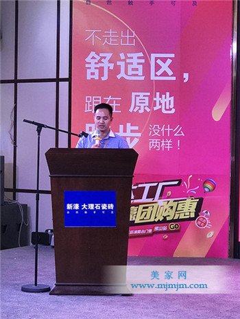 會上,新濠大理石瓷磚副總經(jīng)理王勝首先發(fā)表致辭。他對新濠大理石瓷磚上半年在品牌發(fā)展、活動執(zhí)行等方面所獲得的成績作了高度評價的同時,對本次活動提出了希望。
