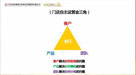 ●從理論到實(shí)際營銷的環(huán)節(jié)自始而終靠的是門店自主運(yùn)營金三角“客戶、產(chǎn)品、團(tuán)隊(duì)”;