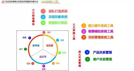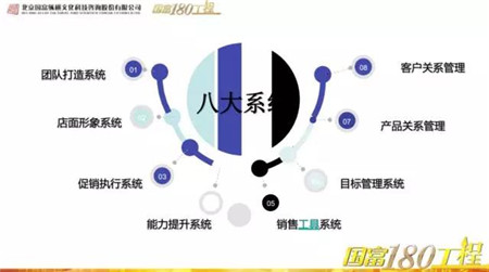 ●離不開八個(gè)系統(tǒng):團(tuán)隊(duì)打造系統(tǒng)、店面形象系統(tǒng)、促銷招待系統(tǒng)、能力提升系統(tǒng)、銷售輔助系統(tǒng)、目標(biāo)管理系統(tǒng)、客戶關(guān)系管理、產(chǎn)品關(guān)系管理。從而解決提升終端門戶進(jìn)店率和客流量。