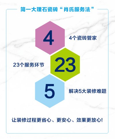 2017年,簡一行業首創“肖氏服務法”, 4個瓷磚管家,23個服務環節,解決消費者5大裝修難題,重新定義高端瓷磚服務標準,讓裝修過程更省心、更安心、效果更放心。簡一通過肖氏服務法在全國范圍的實行,以滿足消費者需求為動力,不斷地進行自我升級和改革,推動高端大理石瓷磚服務升級。