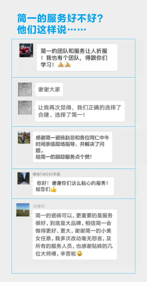 2017年,簡一再次自我變革,升級服務體系。7月19日,簡一將在佛山總部召開“重新定義高端瓷磚服務”——2017簡一大理石瓷磚安心、省心、放心“肖氏服務法1.0”發布會,首度面向公眾、媒體、消費者公布“肖氏服務法”的服務標準,并接受社會各界的監督,把好服務進行到底。同時,簡一呼吁更多同行加入服務升級行列,促進共同發展。