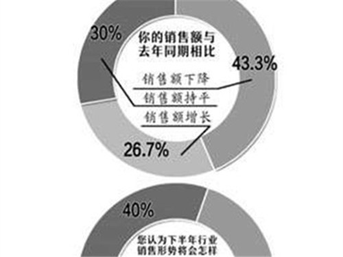 調查數據顯示,在對今年下半年銷售形勢的判斷中,有40%的商戶認為“還將維持當前的不景氣狀態”;有43.3%的商戶認為“形勢將好轉”;還有13.3%的商戶認為“將維持當前的良好態勢”;沒有1個商戶選擇“將更加不景氣”。