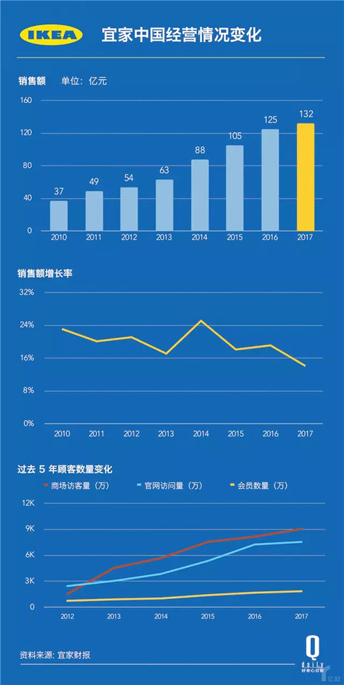 高速增長的中國市場是宜家高度依賴的對(duì)象,但2017財(cái)年它在這個(gè)市場的銷售額、商場訪客數(shù)量、官網(wǎng)訪問量、會(huì)員數(shù)量的增幅相比上一個(gè)財(cái)年分別下降了4.9%、9%、10%和9%。