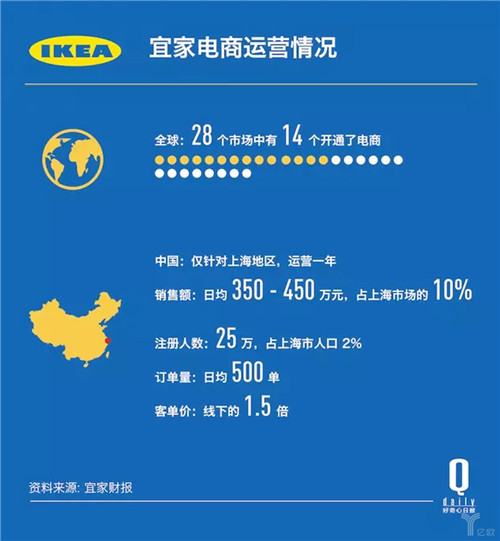 朱昌來告訴《好奇心日?qǐng)?bào)》,運(yùn)營一年以來,宜家上海電商目前單日單店訂單量為500單(單店指負(fù)責(zé)運(yùn)營該地區(qū)電商的上海寶山宜家商場),日均銷售額為350-450萬,占上海市場總銷售額的10%。而客單價(jià)則“比較出乎意料”,是線下的1.5倍。這算是一個(gè)“符合宜家總部預(yù)期的銷售成績”。