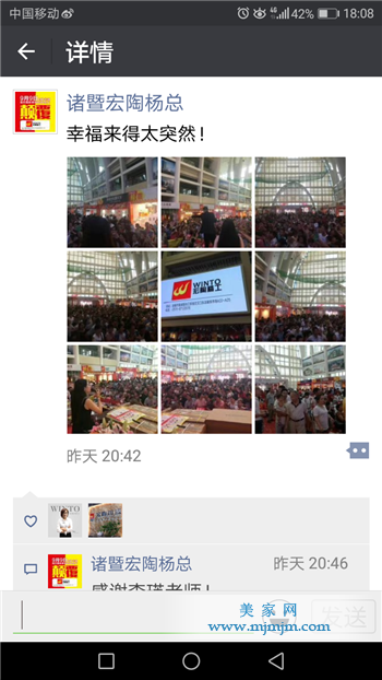 活動持續(xù)兩天方才結(jié)束,宏陶在聯(lián)盟中的表現(xiàn)令其他品牌刮目相看。活動結(jié)束后,諸暨楊總在朋友圈配上活動照片,并興奮寫下“幸福來得太突然”的話語,活動的收獲溢于文字。諸暨宏陶在此次砍價中表現(xiàn)優(yōu)異,最重要的因素是產(chǎn)品品質(zhì)過硬,品牌在當(dāng)?shù)氐姆e累沉淀,以及團(tuán)隊的通力合作和配合。