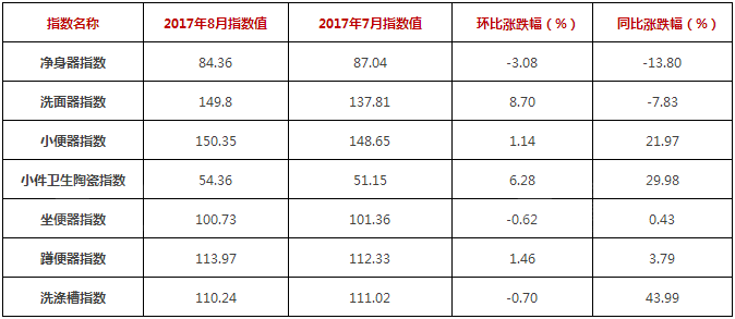 表四、2017年8月與2017年7月衛生陶瓷系列指數走勢環比及與上年度同比漲跌幅