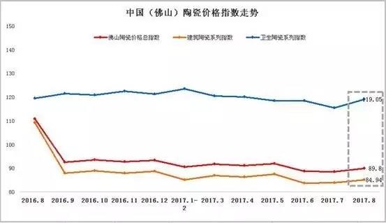 8月佛山陶瓷價格總指數報89.80點,環比升1.57%,同比跌18.88%;建筑陶瓷系列指數報84.94點,環比升1.24%,同比跌22.25%;衛生陶瓷系列指數報119.05點,環比升3.07,同比跌0.34%。