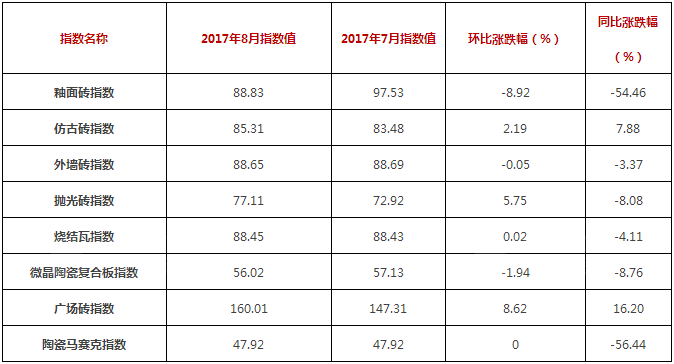 表三、2017年8月與2017年7月建筑陶瓷系列指數走勢環比及與上年度同比漲跌幅