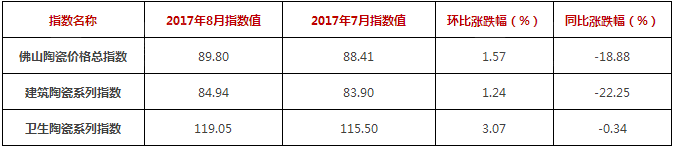 表二、2017年8月與2017年7月佛山陶瓷價格總指數及建筑、衛生陶瓷系列指數走勢環比及與上年度同比漲跌幅
