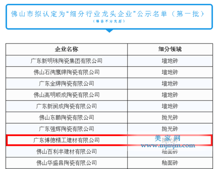 11月22日,佛山市質量強市工作領導小組辦公室發布《佛山市擬認定為“細分行業龍頭企業”名單公示(第一批)》,廣東博德精工建材有限公司等154家企業擬認定為佛山市第一批細分行業龍頭企業,其中陶衛行業有30家企業上榜。