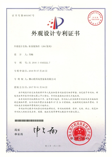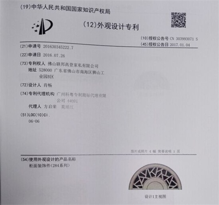 外觀設(shè)計(jì)專利(Industrial Design)是指對(duì)產(chǎn)品的形狀、圖案或其結(jié)合以及色彩與形狀、圖案的結(jié)合所做出的富有美感并適于工業(yè)應(yīng)用的新設(shè)計(jì)。聯(lián)邦高登全屋定制新中式系列產(chǎn)品憑借典雅的配色與飾面一經(jīng)問世便大受歡迎。其中極具東方韻味的柜面裝飾件自2016年發(fā)布,便擁有外觀設(shè)計(jì)專利,受我國(guó)《專利法》保護(hù)。