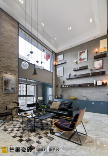 客廳用一種線性連貫的手法,讓整個挑高空間渾然一體。自然光與燈光的融合,瓷磚墻面與大理石地面的融合,云海般的琥鉑色石材主題墻與灑脫墨跡般的灰白地面的融合,鏈接了各種高級感。飽和的灰藍組合低柜與多造型燈具組,賦予空間年輕感,將德式復合趣味演繹地栩栩如生。