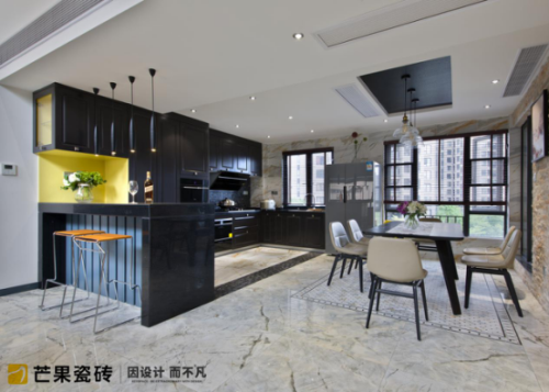 幾近明凈的玻璃窗為用餐空間帶來充裕的自然采光,使得整個用餐區更顯通透明亮。石紋地磚搭配神秘黑家具,干凈利落而又不失個性格調。清新淡雅的插花點綴其間,透露出主人對高雅生活品質的追求。