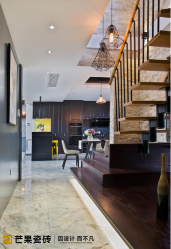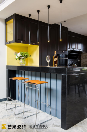 神秘黑的吧臺突現芒果黃的一隅,醒目而又摩登。垂直而下的吊燈簡潔大氣,勾勒出主人精致而又舒適的生活格調。