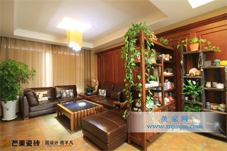 無須雕琢張揚,幾何直線的造型讓整個會客空間更顯穩重大方。暖橙地磚搭配深色系沙發,圍合出穩靜而又坦誠的晤談氣氛。生機盎然的綠植布置,與古樸雅拙的船木書柜相映成趣,散發出靈動而又清澈的氣韻。