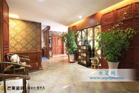 過道以古樸做舊的圓角仿古磚打底,輔之做工精致,雕刻精細的實木桌椅作為點綴裝飾,增加了過道空間濃郁的懷舊氣息。