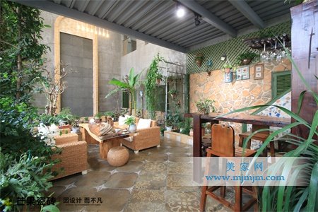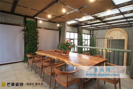 自然采光的花園休憩區,高低綠植錯落有致,原生木材條案、流水幕墻、LOFT風墻面,共同構建出一個沁人心脾的草木世界。由花磚和切角仿古瓷磚拼貼出的復古地面,凸顯了整個空間的深邃與雅致。自然性與人文感穿插貫通,雅趣怡人。