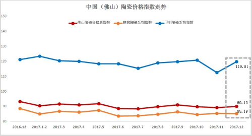12月份,受環保政策壓力及原材料成本上漲影響,多數陶企準備進入停窯檢修期,佛山陶瓷廠商加大力度去庫存、提銷量,多數代表品成交量上漲,市場進入清貨期。本月佛山陶瓷價格總指數90.13點,環比漲0.92%,同比跌3.36%;建筑陶瓷系列指數85.19點,環比跌0.28%,同比跌3.87%;衛生陶瓷系列指數119.81點,環比升6.38%,同比跌1.11%。