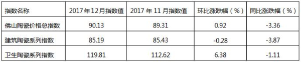 表二、2017年12月與2017年11月佛山陶瓷價格總指數及建筑、衛生陶瓷系列指數走勢環比及與上年度同比漲跌幅