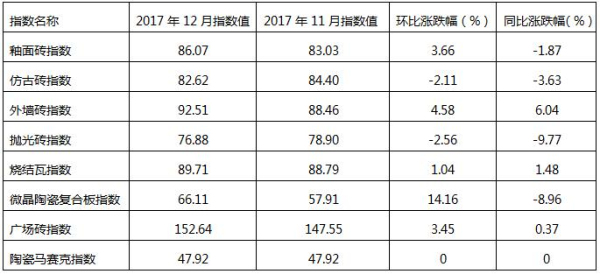 表三、2017年12月與2017年11月建筑陶瓷系列指數走勢環比及與上年度同比漲跌幅