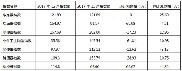 表四、2017年12月與2017年11月衛生陶瓷系列指數走勢環比及與上年度同比漲跌幅