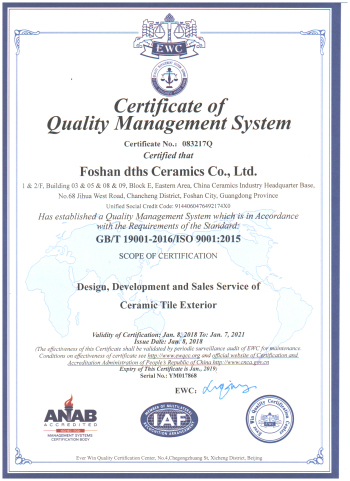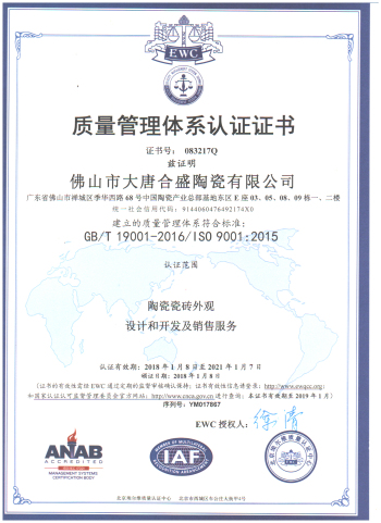 近日,佛山市大唐合盛陶瓷有限公司(大唐合盛瓷磚)正式通過了ISO9001:2015質量管理體系認證,并獲得認證證書,成為目前行業首批通過2015版質量管理體系認證的企業。這標志著大唐合盛瓷磚在陶瓷瓷磚外觀設計和開發及銷售服務方面已達到國際化標準,獲得了國際權威組織的認可。
