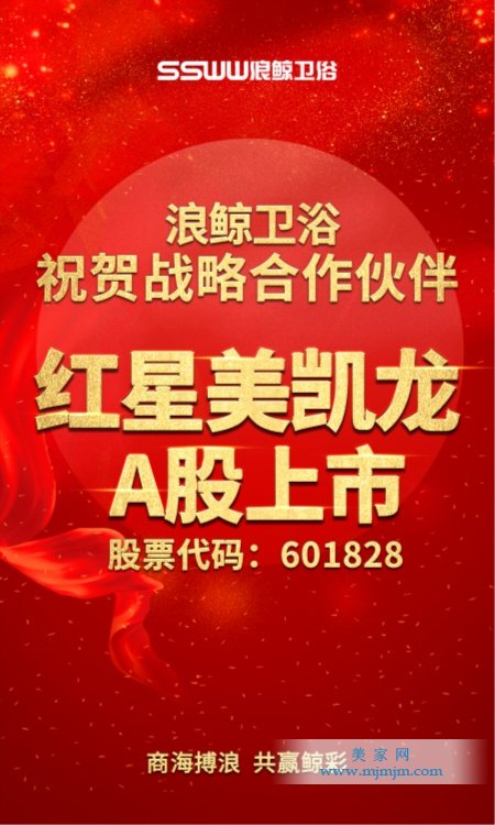 2018年1月17日上午,隨著上海證券交易所鑼聲的響起,紅星美凱龍家居股份有限公司成功登陸A股,成為中國家居零售行業A+H第一股。作為紅星美凱龍的戰略合作伙伴,浪鯨衛浴也在第一時間送上祝福。