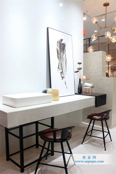 在設計上,露美娜展廳精心設計,將產品陳列和實際運用相結合,展廳分為洽談展示區、浴室、洗手間、客廳、吧臺、前臺幾大區域,每一個空間都能找到露美娜產品與實際運用場合的契合點,為消費者和設計師提供了空間設計的范本。