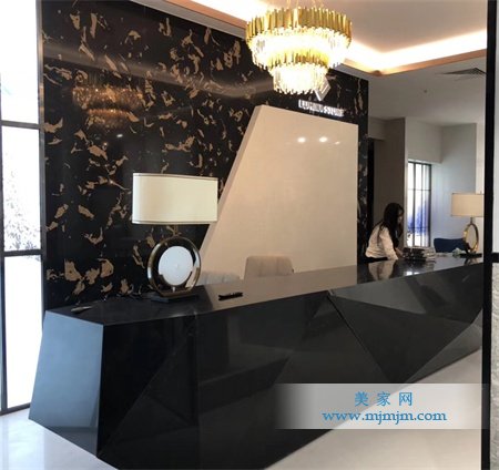 前臺背景墻采用的是露美娜名貴款BARNA(黑金花)——LM882加上時尚款MARE NOSTRUM(海洋碧)——LM311,大有奢華夢幻的質感;地面采用的是尊貴款TOLEDO(托萊多)——LM839,配合背景墻使用,提升整體檔次;桌面造型猶如揚帆起航,采用的是尊貴款LAS FALLAS(法雅亮)——LM885。