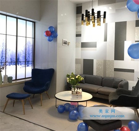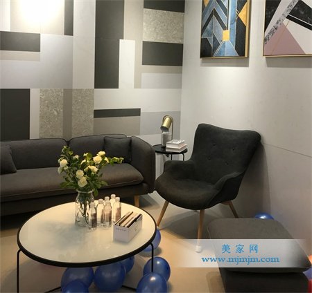 客廳模擬區背景墻采用的是ALCALÁ(古典翠)——LM913、VIGO(維戈灰)——LM869、MARE NOSTRUM(海洋碧) ——LM311、LEÓN(萊昂灰)——LM827、TOLEDO(托萊多)——LM839,五款產品混合搭配,營造出馬賽克般立體多彩的效果,整體簡約別致。墻面采用的是LUGO GREY(盧戈冬)——LM834,搭配灰色的沙發、白色的茶幾、藍色的休閑椅,格調上給人感覺簡單卻不平常。
