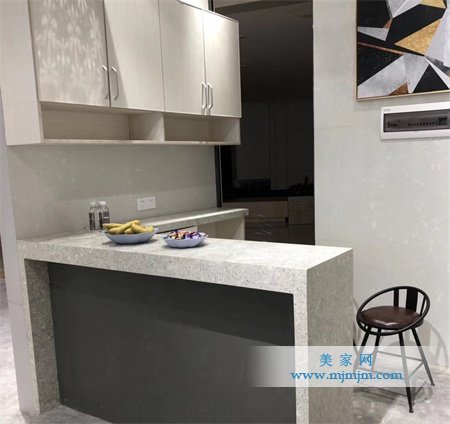 吧臺臺面采用的是仿石系列LUGO GREY(盧戈冬)——LM834,可多方面進行利用,不僅可以是休閑的酒吧臺、還可以是家人小聚的餐桌、或者是閑暇時的插花桌,吧臺雖小,功能確是相當的齊全。地面采用的是較耐灰的TOLEDO(托萊多)——LM839。