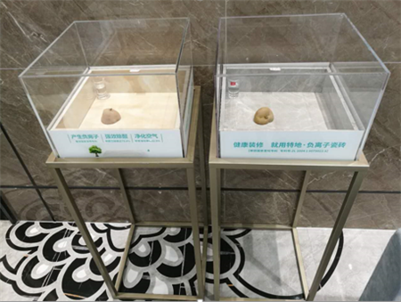 通過密閉的負離子瓷磚箱和密閉的非負離子瓷磚箱中,放置的植物的氧化情況,來判斷是否產生負離子,且有效緩解氧化情況。