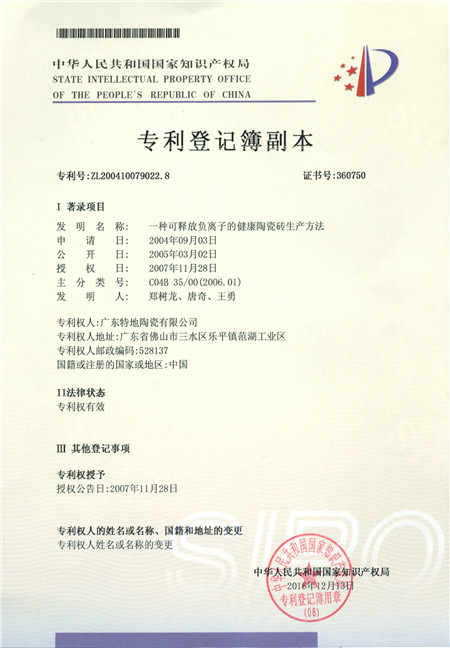 三、負離子瓷磚發明專利證書