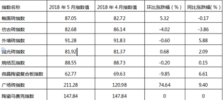表三、2018年5月與2018年4月建筑陶瓷系列指數走勢環比及與上年度同比漲跌幅