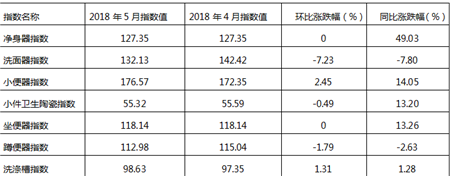 表四、2018年5月與2018年4月衛生陶瓷系列指數走勢環比及與上年度同比漲跌幅