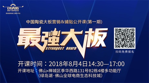 “最強大板”中國陶瓷大板營銷&鋪貼免費公開課第一期,將于8月4日在佛山市禪城區(qū)季華西路131號綠島湖•佛山全球電商生態(tài)科技城B2棟4樓大會議室舉辦,誠邀陶瓷行業(yè)各界人士參加。