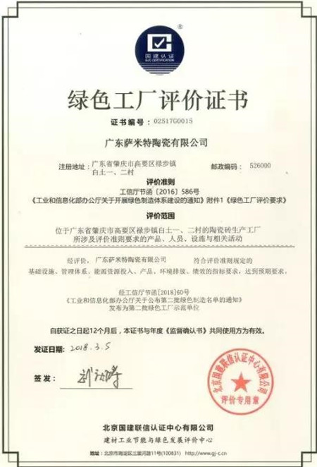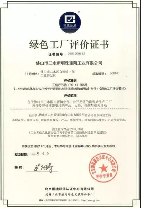 新明珠陶瓷集團作為綠色工廠代表接受嘉獎。集團旗下的佛山市三水新明珠建陶工業有限公司和廣東薩米特陶瓷有限公司,這兩家被國家工信部評選為“綠色工廠”的單位,正式加入全國綠色工廠推進聯盟。