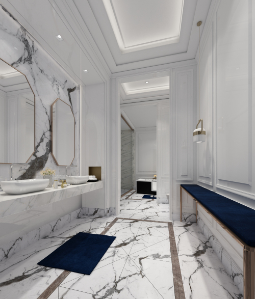 隨著人們對家居生活的品質追求,他們更在意自己內心的舒適感。衛浴間方面,設計師在亮白的主背景色調下,以地磚豐富而不凌亂紋理打破冰冷感,加以寶藍色和金屬邊的物件點綴,更豐富了整體空間的層次感,簡潔而不失優雅,高貴大方。