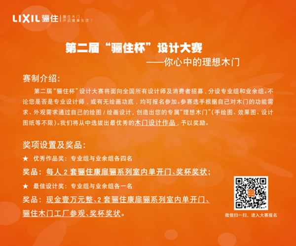 第二屆“驪住杯”設計大賽分為專業組與業余組,沒有繪畫技能、專業素養的硬性要求,對設計師或愛好者平等展開。驪住木門將本次比賽作為一個窗口,了解居住群體對木門的普遍要求、特殊愛好,每一位用作品傳遞理想的參賽者,都將使驪住木門未來的產品更加貼近人們的日常生活需要,令家裝用品的使用價值更上一層樓。