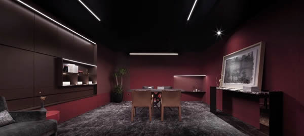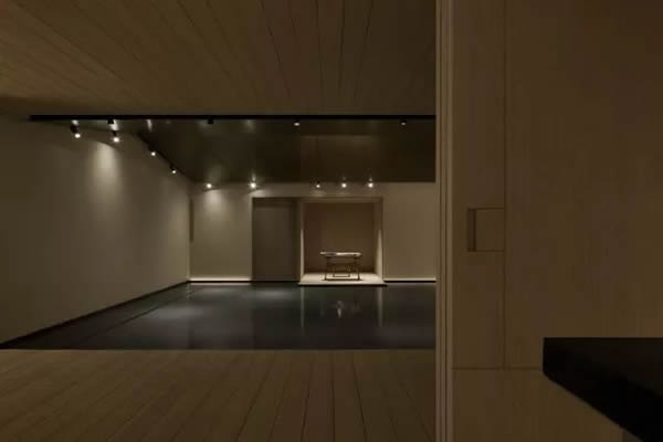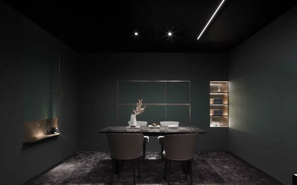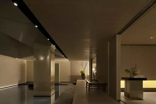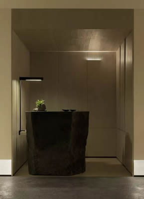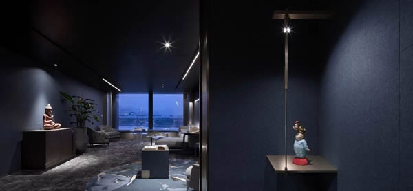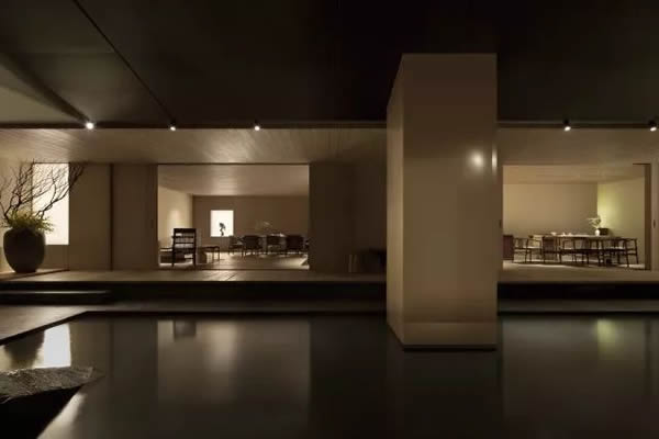 天花上幾乎沒有光,他的本意是盡量解放光,在墻角、墻上、墻面,以點、線、面的模式搭建整個空間中光的語言,水內的倒影再以低幾個亮度的光線去補充,這樣便隨著整體的明暗關系生成了想要的空間意境。