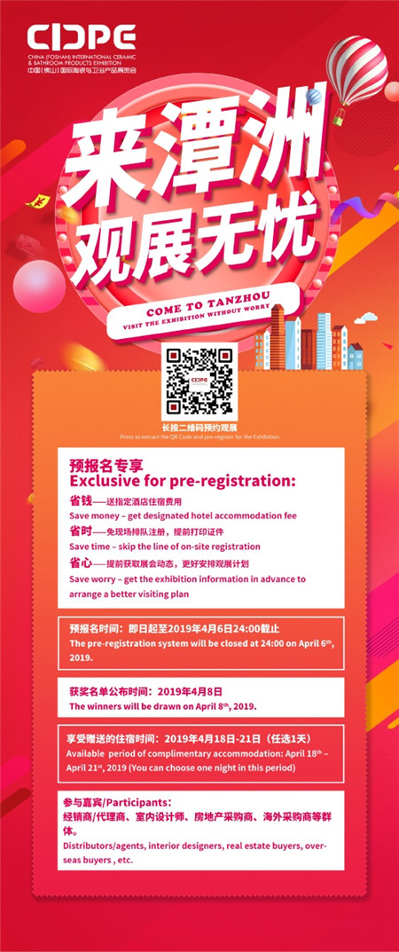 凡是在“中陶產品展CICPE”微信公眾號上登記預報名觀展的前30名嘉賓,即有機會獲得2019中陶產品展CICPE組委會指定酒店房費返還優惠!
