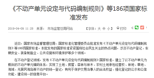 市場(chǎng)監(jiān)管總局:《不動(dòng)產(chǎn)單元設(shè)定與代碼編制規(guī)則》國(guó)家標(biāo)準(zhǔn)發(fā)布,實(shí)現(xiàn)土地、房屋等不動(dòng)產(chǎn)的統(tǒng)一登記