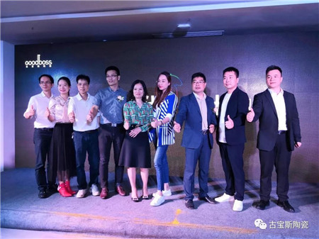 當(dāng)天下午,古寶斯陶瓷全新logo也正式發(fā)布,并由新潤豐集團董事長夫人伍海云、新潤豐集團副總裁林瑩女士、佛山市連鎖企業(yè)協(xié)會執(zhí)行會長鄭文武、古寶斯陶瓷董事總經(jīng)理孫世權(quán)、智造聯(lián)盟董事長金亞范、華夏陶瓷網(wǎng)總編輯劉小明、環(huán)聲品牌策劃機構(gòu)創(chuàng)始人廣業(yè)老師為大家揭曉新logo的神秘形象,現(xiàn)場近40名媒體朋友、古寶斯陶瓷全體員工一同見證了這歷史性一刻。
