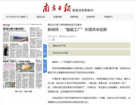 2018年1月23日,新明珠陶瓷集團(tuán)的綠色智能制造示范工廠被中國(guó)建筑衛(wèi)生陶瓷協(xié)會(huì)正式授予 “中國(guó)建筑陶瓷綠色智能制造示范基地”。
