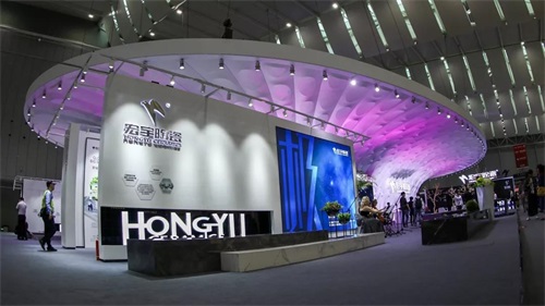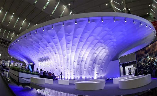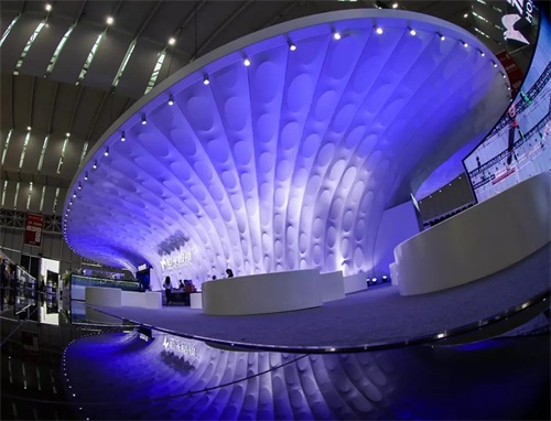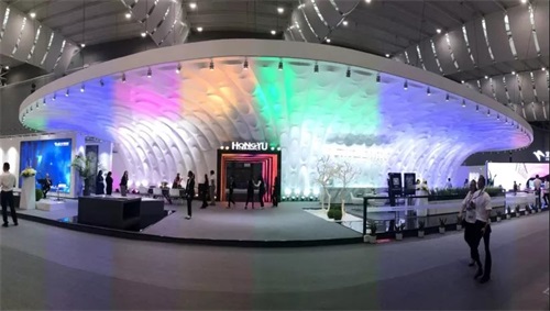 據宏宇事業部創意品展中心副總經理、總設計師陳天培介紹:本次展館的設計從宇宙、空間、大樹中汲取靈感;以樹的形態和波濤紋理為基礎,營造出外漂式樹冠;通過樹冠無限延伸的弧面,寓意“大音希聲,大方無隅,大象無形”的哲學境界,與宏宇“大宇宙、大胸懷、大發展”的品牌文化高度契合。