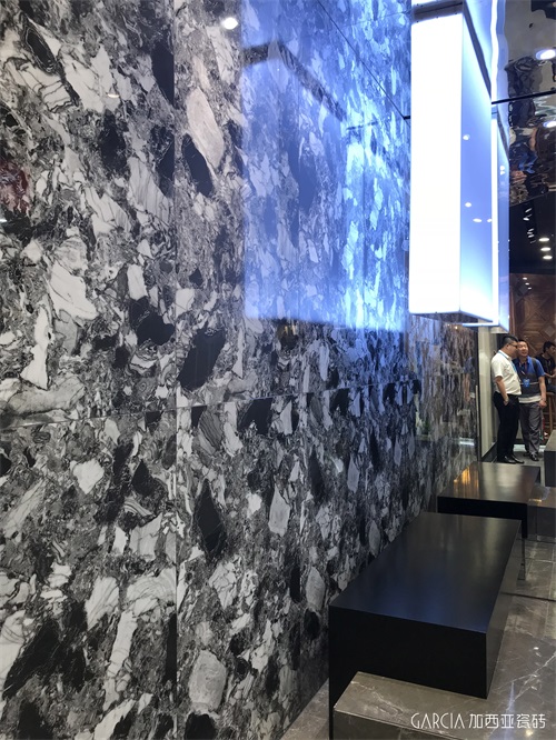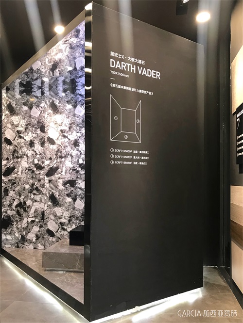 走進(jìn)黑盒子里,未來感的空間設(shè)計(jì),眼前一亮,充滿無限想象。加西亞瓷磚主要展示了以750*1500mm為主的爆款IP黑武士X·大板大理石瓷磚,帶來質(zhì)感、紋理、花色、品位的超進(jìn)化。