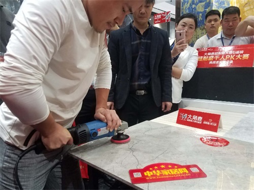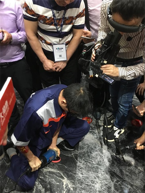 看這些選手的動作就知道他們非常專業,懂得集中力量在一邊,現場也能聞到機器高強度摩擦磚后產生的特殊異味,然后,大角鹿超耐磨大理石瓷磚在重磨之下并沒有磨花。 在鋼刷使勁摩擦和打磨機重磨之下,大角鹿超耐磨大理石瓷磚依然沒有被磨花,現場經過協商后,選手們都贊同打成平手,平分活動獎金。
